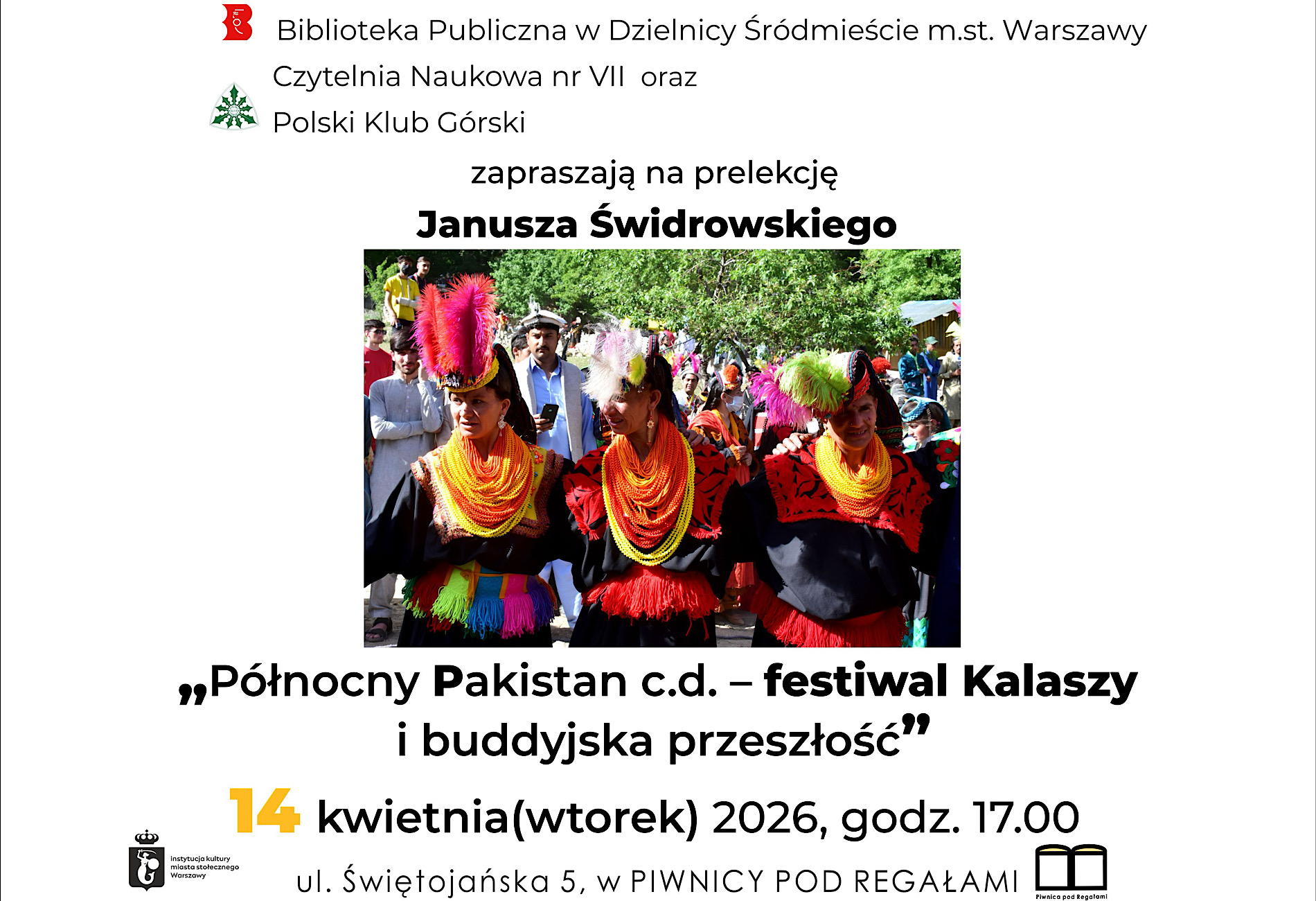 Czytelnia Naukowa Nr VII oraz Polski Klub Górski zapraszają 14 kwietnia o godzinie 17:00 na prelekcję Janusza Świdrowskiego pt. "Północny Pakistan c.d. - festiwal Kalaszy i buddyjska przeszłość".