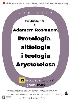 Biblioteka Publiczna w Dzielnicy Śródmieście m.st. Warszawy zaprasza na wykład Adama Rosłana pt. "Protologia, aitiologia i teologia Arystotelesa".