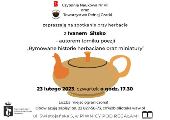 23 lutego o godzinie 17:30 cykl rozpocznie spotkanie autorskie z Ivanem Sitsko - pasjonatem herbaty oraz twórcą tomiku poezji "Rymowane historie herbaciane oraz miniatury".