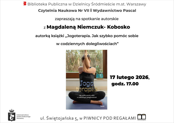 Czytelnia Naukowa Nr VII Biblioteki Publicznej w Dzielnicy Śródmieście m.st. Warszawy oraz Wydawnictwo Pascal zapraszają na spotkanie autorskie z Magdaleną Niemczuk-Kobosko, autorką książki "Jogoterapia. Jak szybko pomóc sobie w codziennych dolegliwościach".