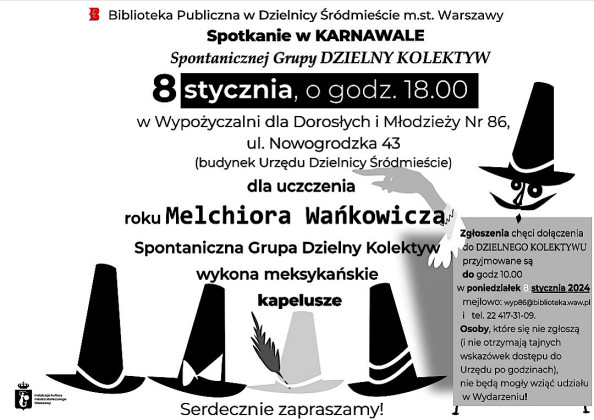 Spontaniczna Grupa DZIELNY KOLEKTYW zaprasza w poniedziałek, 8 stycznia o godz. 18:00 do Wypożyczalni dla Dorosłych i Młodzieży Nr 86, ul. Nowogrodzka 43 (budynek Urzędu Dzielnicy Śródmieście) na spotkanie dla uczczenia roku Melchiora Wańkowicza. Spontaniczna Grupa DZIELNY KOLEKTYW wykona KAPELUSZE MEKSYKAŃSKIE.