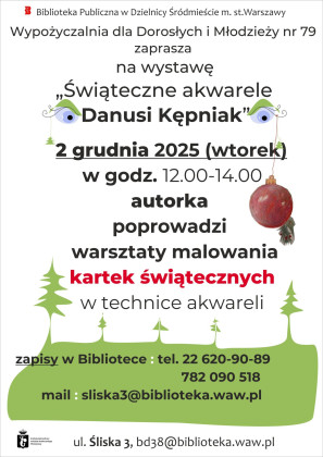 Wypożyczalnia dla Dorosłych i Młodzieży Nr 79 (ul. Śliska 3) zaprasza na wystawę "Świąteczne akwarele Danusi Kępniak".