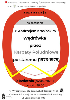 Biblioteka Publiczna w Dzielnicy Śródmieście m.st. Warszawy oraz Stowarzyszenie Res Carpathica zapraszają na spotkanie z Andrzejem Krasińskim pt. "Wędrówka przez Karpaty Południowe po staremu (1973-1975)".