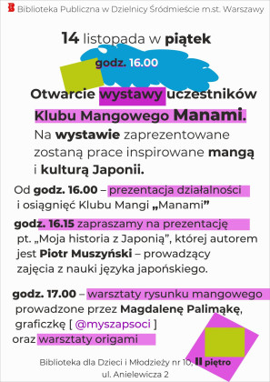Biblioteka dla Dzieci i Młodzieży Nr 10 przy ul. Anielewicza 2 zaprasza 14 listopada na otwarcie wystawy uczestników Klubu Mangowego Manami.