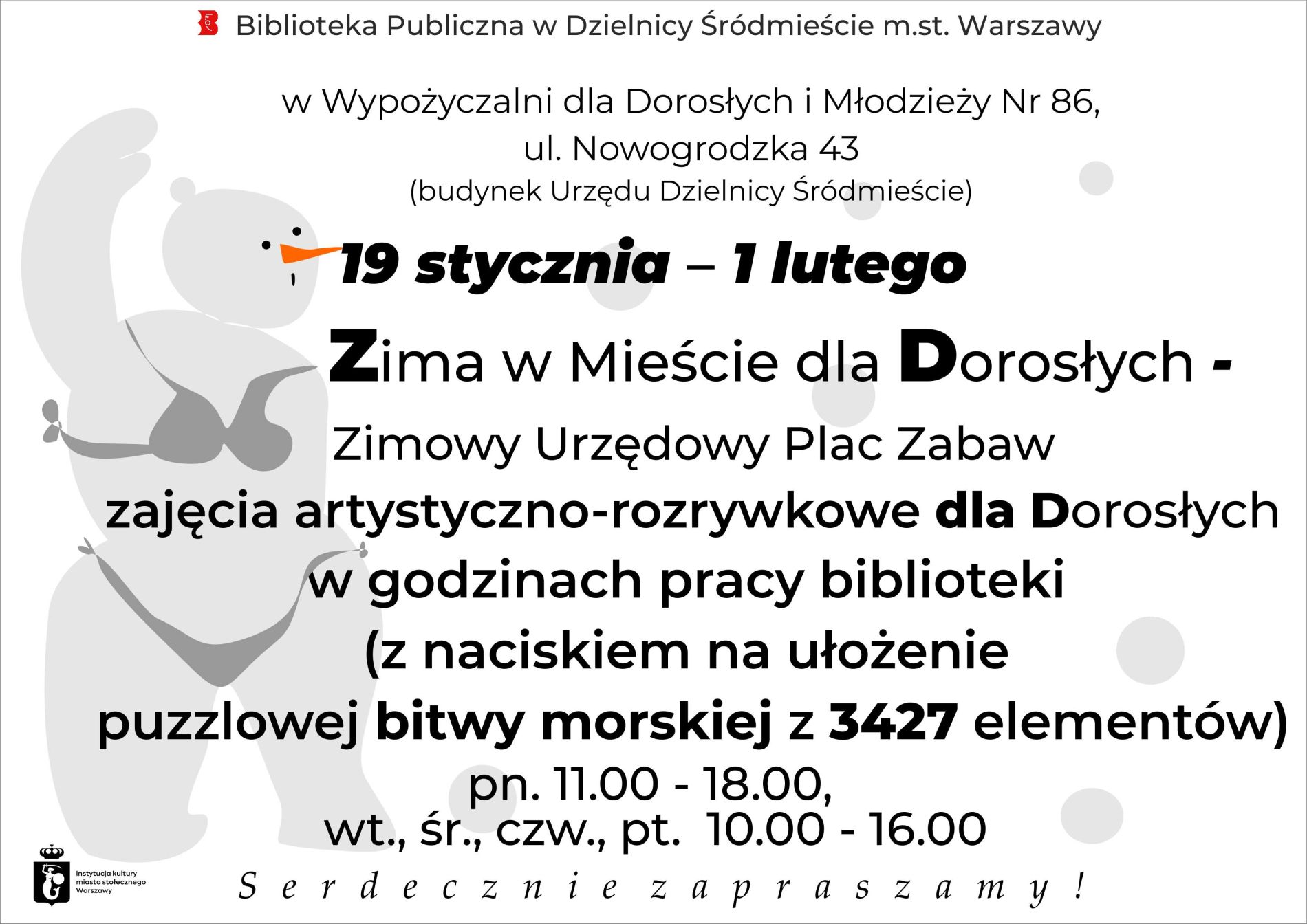 Wypożyczalnia dla Dorosłych i Młodzieży nr 86, ul. Nowogrodzka 43 (budynek Urzędu Dzielnicy Śródmieście) zaprasza na Zimę w Mieście dla Dorosłych – Zimowy Urzędowy Plac Zabaw dla Dorosłych - zajęcia artystyczno-rozrywkowe dla dorosłych (z naciskiem na ułożenie puzzlowej bitwy morskiej z 3427 elementów).